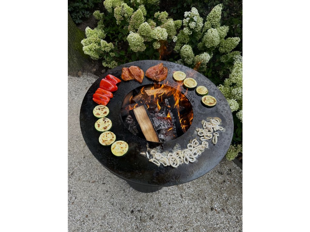 S ohništěm a grilem BonBiza získáte doma všestranný „gril“. Pečicí plech o tloušťce 6 mm, který leží na ohništi Ø 80 cm, je ideální jako povrch na vaření a pečení. Teplo vyzařuje postupně od středu ohniště k okraji plechu na pečení, takže grilovací deska má několik teplot, a je proto vhodná pro všechny druhy přípravy, jako je grilování masa, vaření zeleniny nebo ryb.