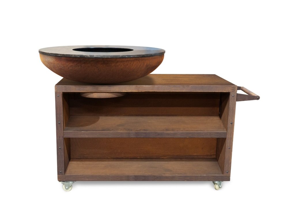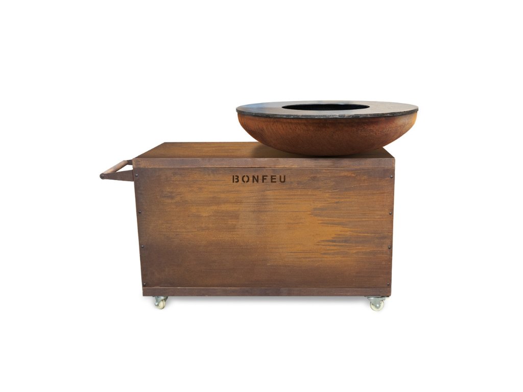 Vedle ohniště této mobilní venkovní kuchyně je prostor pro náš řeznický blok BonFeu. Pod pracovní deskou najdete prostor pro různé kuchyňské doplňky a další polena. Stabilní a vábící kolečka usnadňují umístění BonBiza Island kamkoli chcete na zahradě. A spolu s kuchyňským příslušenstvím BonFeu je BonBiza Island kulinářským doplňkem vašeho venkovního prostoru.