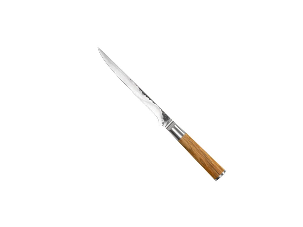 Filetovací nůž Forged Olive s úzkou 20,5cm čepelí z japonské oceli je ideální pro snadné a přesné porcování ryb. Ruční výroba, pevná olivová rukojeť a luxusní dřevěné balení z něj dělají elegantní a vysoce kvalitní doplněk každé kuchyně.