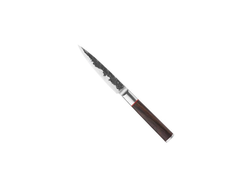 Nůž je ručně kovaný z japonské oceli, která vyniká dlouhou výdrží ostří a snadnou údržbou. Čepel o délce 12,5 cm má tloušťku 2 mm, tvrdost 58 HRC a je broušena pod úhlem 18°, což zajišťuje přesné a plynulé řezy.