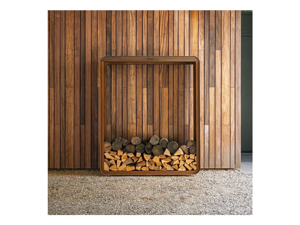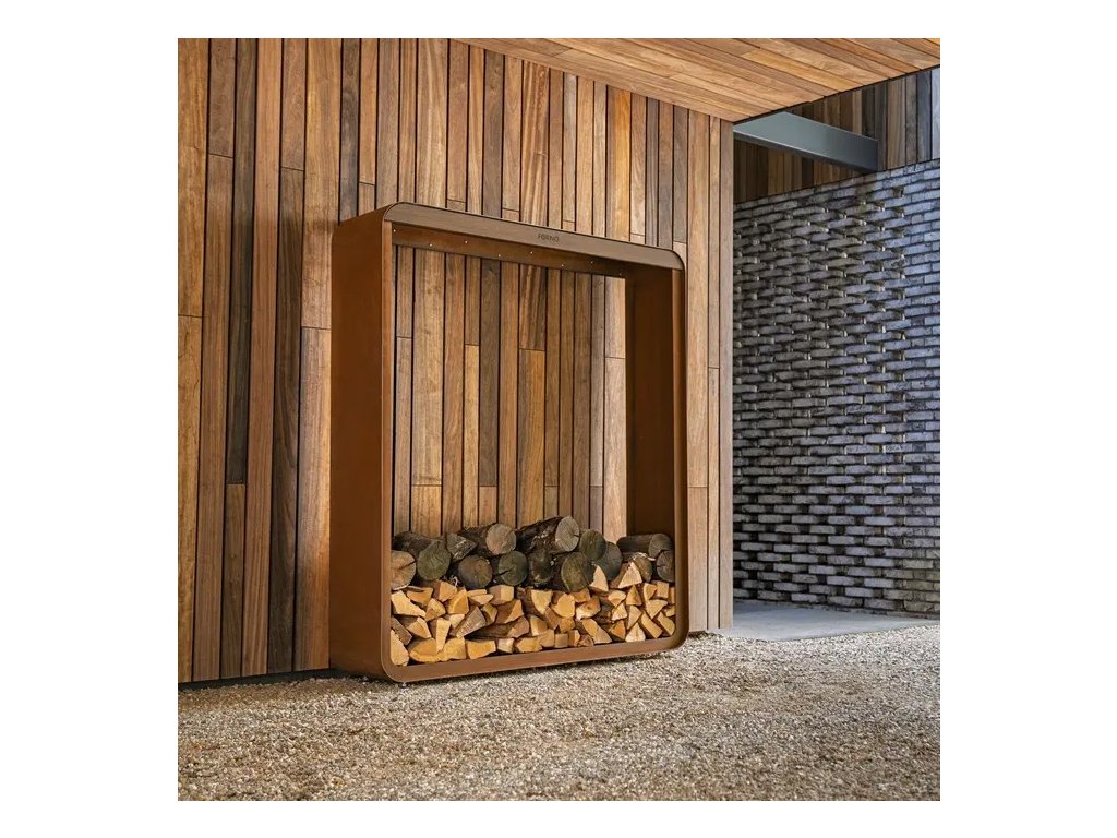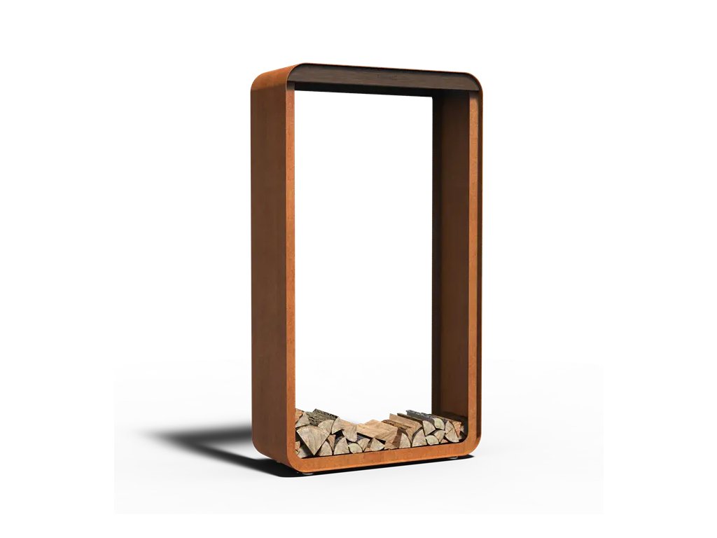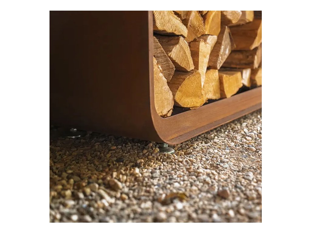 Je vyrobena z cortenové oceli – pevného materiálu, který má teplou, rezavě hnědou barvu. To nejen krásně vypadá, ale také chrání materiál před povětrnostními vlivy. Díky otevřené struktuře zůstává vaše dřevo dobře větrané a suché.
